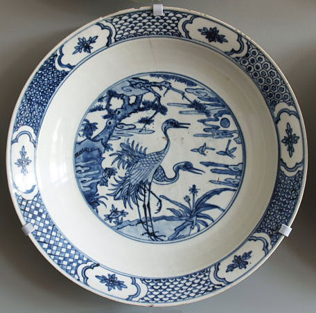 Schotel met decor van 2 kraanvogels in rivierlandschap, Swatow (Q25673)