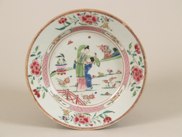 Bord met decor van figuren in een tuinlandschap, famille rose (Nederlands)