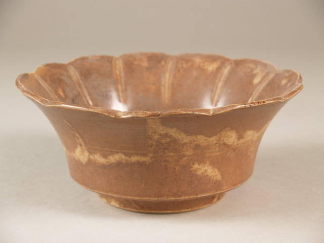 Kom met geschulpte rand en onregelmatig bruin glazuur