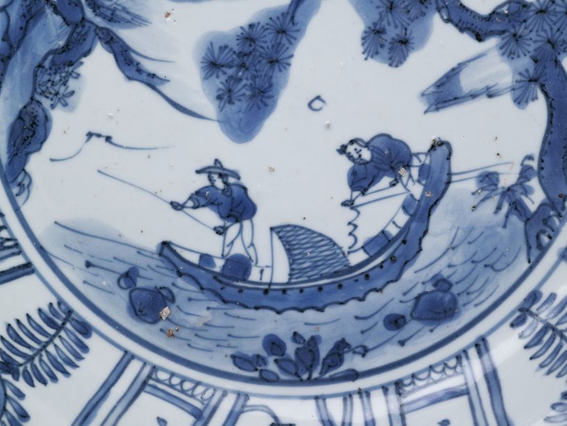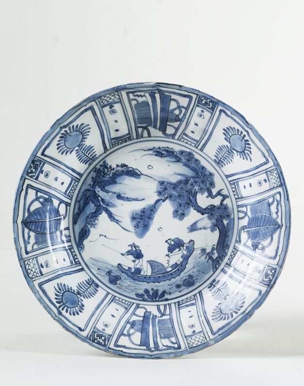 | Nederlands | Schotel met decor van een pijnboom en 2 vissers in een boot omgeven door vakken met een perziktak of symbolen |