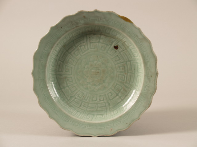 Bord met accoladevormige rand en met decor van meander en bloem (Nederlands)