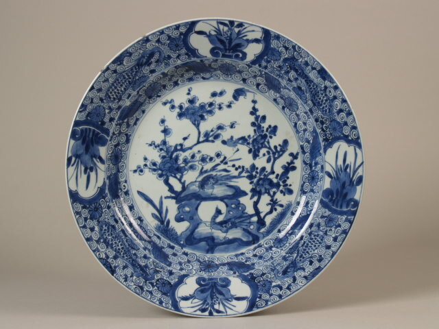 Schotel met een beschildering van een rotslandschap met bloeiende takken (Nederlands)