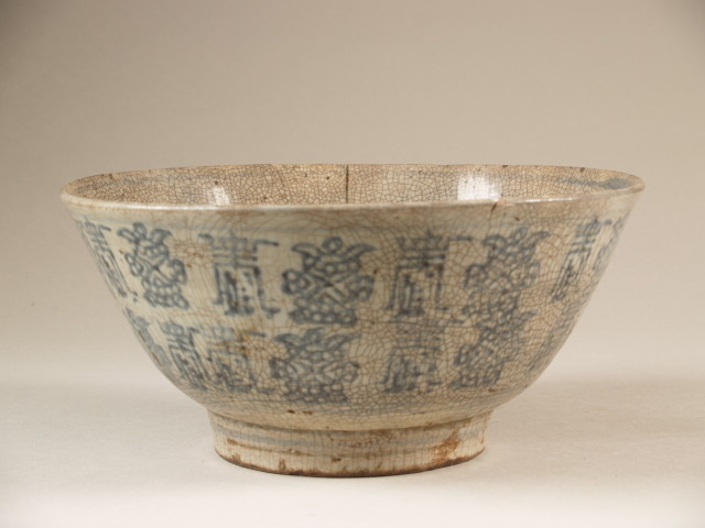 Kom, zwaar gecraqueleerd grijs glazuuur, met onderglazuurblauw decor, provinciaal