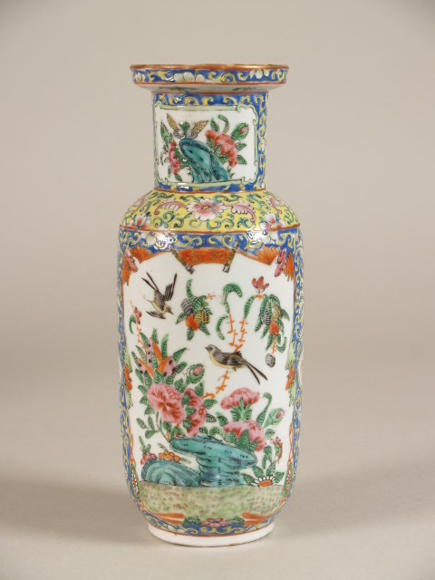 Vaas met decor van bloeiende planten met vlinders bij rots en vleermuizen, verder boekrollen met opschriften