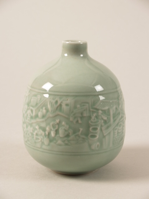 Vaas met als onderwerp van het decor de porseleinproductie, celadon (Q26840)
