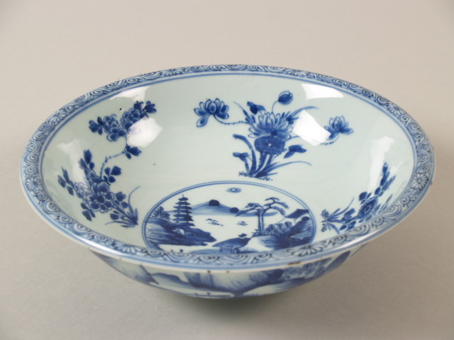 | Nederlands | Kom met decor van rivierlandschap aan de buitenzijde en het plat, de wand met decor van 4 bloemranken |