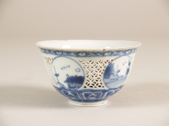 Kom met decor van rivierlandschappen in medaillons en linglong wand (Q26862)