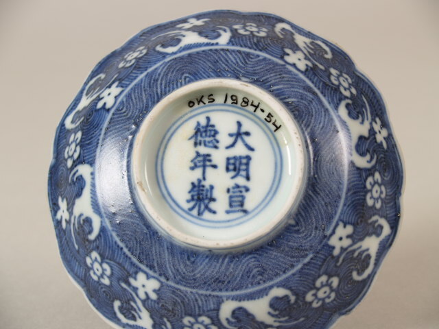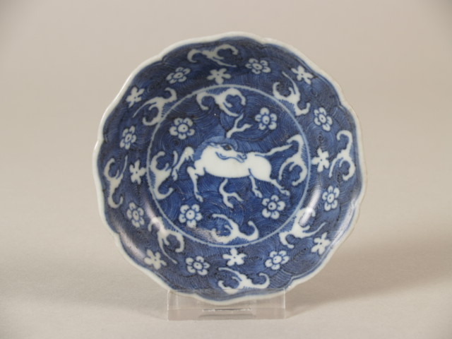 Schaaltje met geschulpte rand en decor van paard tussen bloemen op een ondergrond van wolken (Nederlands)