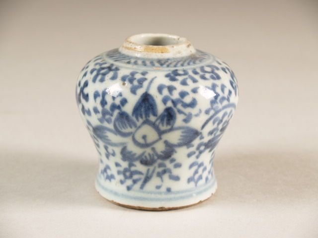 Potje zonder deksel met decor van lotus en ranken in onderglazuur blauw (Nederlands)
