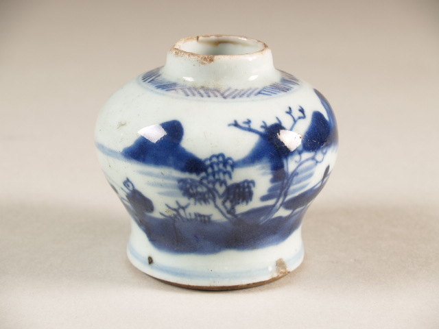| Nederlands | Potje zonder deksel met decor van rivierlandschap in onderglazuur blauw |