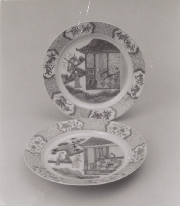 2 borden met decor van interieur waarin figuren (Nederlands)