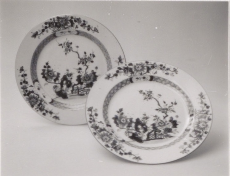 2 borden met decor van tuinlandschap met bloeiende planten, imari (Q26971)