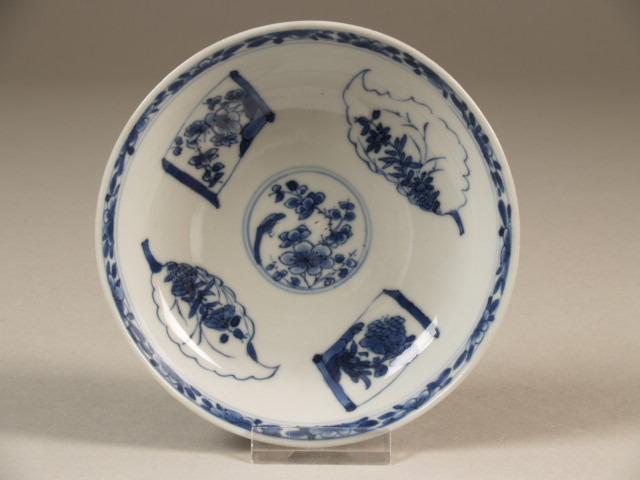 Schoteltje zonder kop met decor van bladvormige en rolvormige vakken, waarin bloemen (Q27017)
