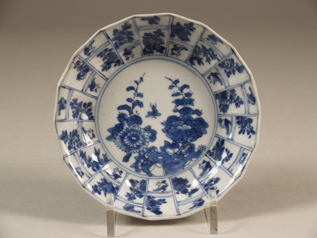 Schotel, veelhoekig, met decor van panelen waarin bloemen en vogels (Nederlands)