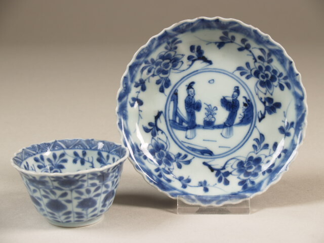 Kop en schotel met decor van vakken waarin figuren of bloemranken, 1 van 13 (Nederlands)