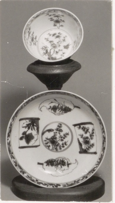 5 Kop en schotels met decor van bladvormige en rolvormige vakken, waarin bloemen (Nederlands)