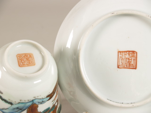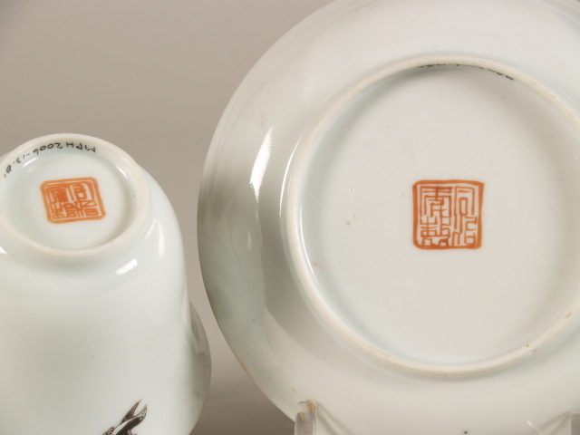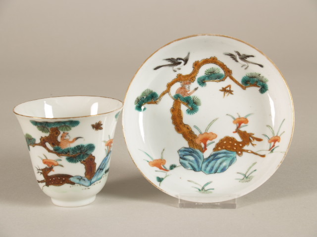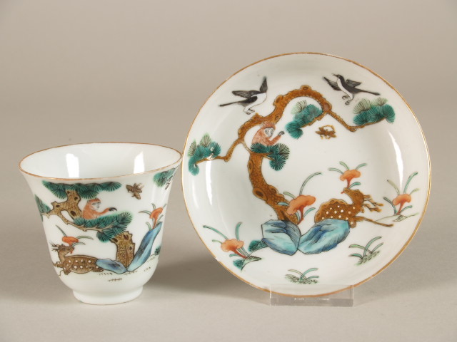 2 Kop en schotels met decor van een pijnboom en dierfiguren (Nederlands)