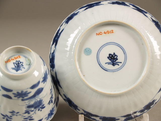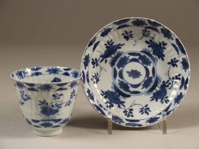 Kop en schotel met golvende rand en decor van bloem- en bladmotieven, 1 van 12 (Q27142)