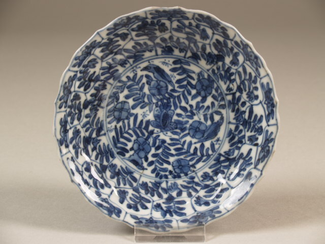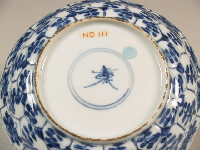 Op de bodem in kobaltblauw een lingzi in een dubbele cirkel. (Nederlands)