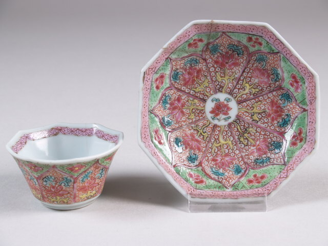 | Nederlands | Kop en schotel, achthoekig, met decor van petalen waarin bloemmotieven, famille rose, 1 van 3 |