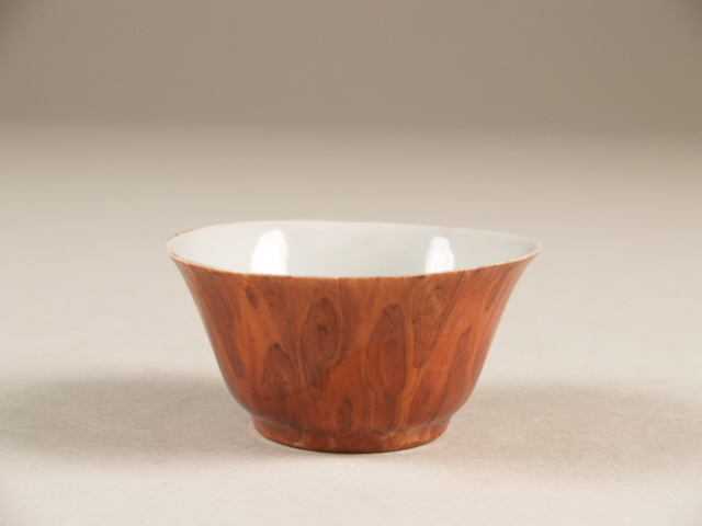 Kop met aan de buitenkant decor van met een bruin fond geïmiteerd hout (Nederlands)