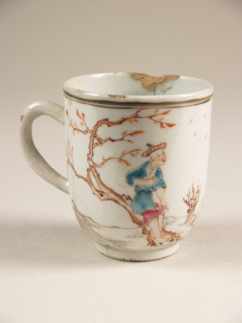 Kop met oor en decor van landschap met figuren in emails famille rose (Nederlands)