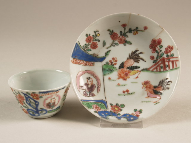 | Nederlands | Kop en schotel met decor van 2 vechtende hanen in een tuin, famille rose |