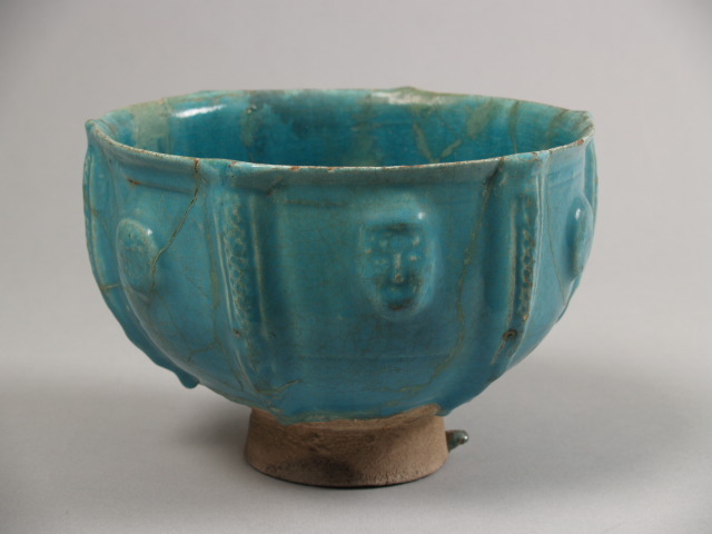 Kom, monochroom turquoise, met gezichten (Q27375)