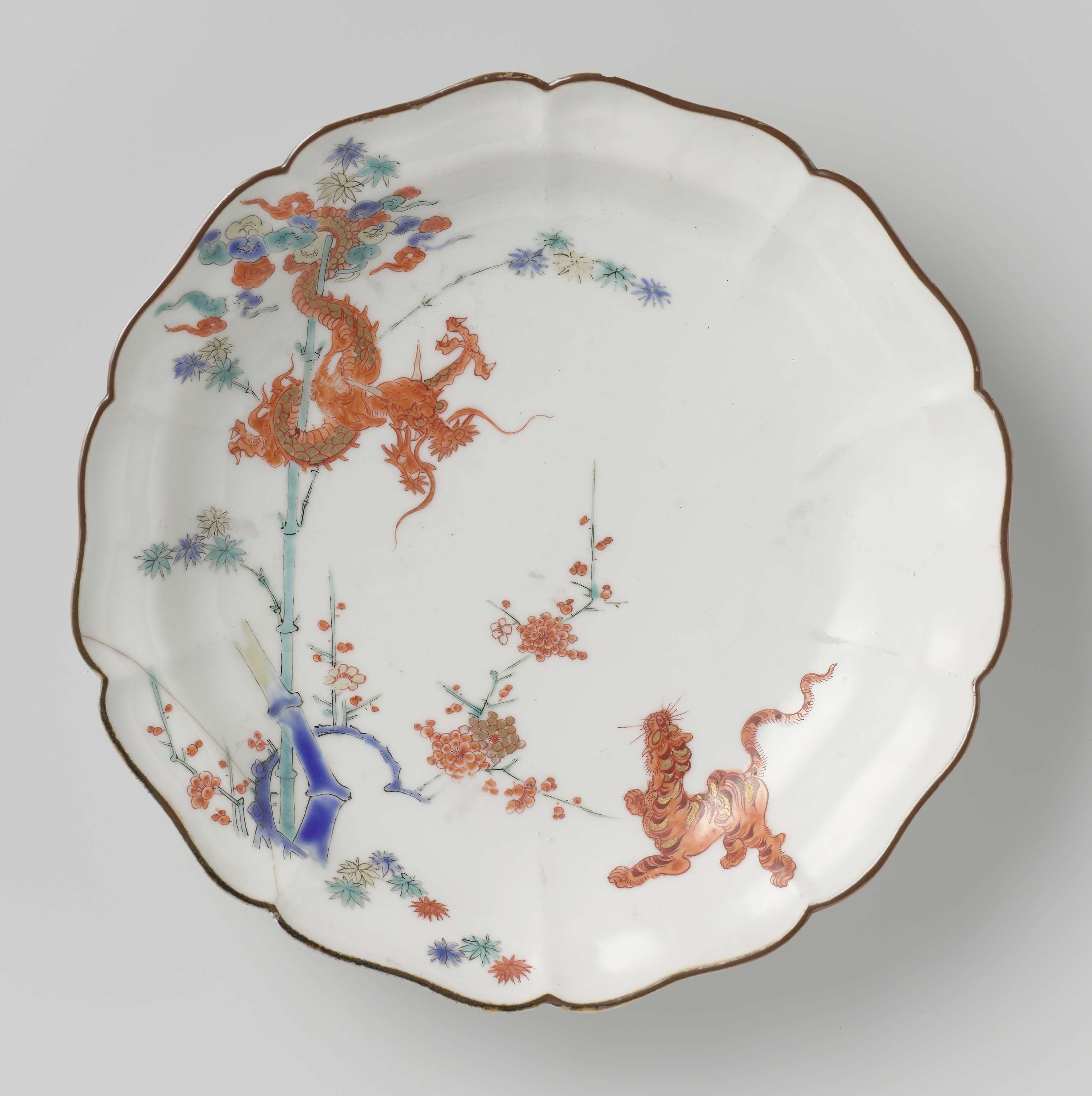 | Nederlands | Lobed dish with dragon, tiger, bamboo and prunus |