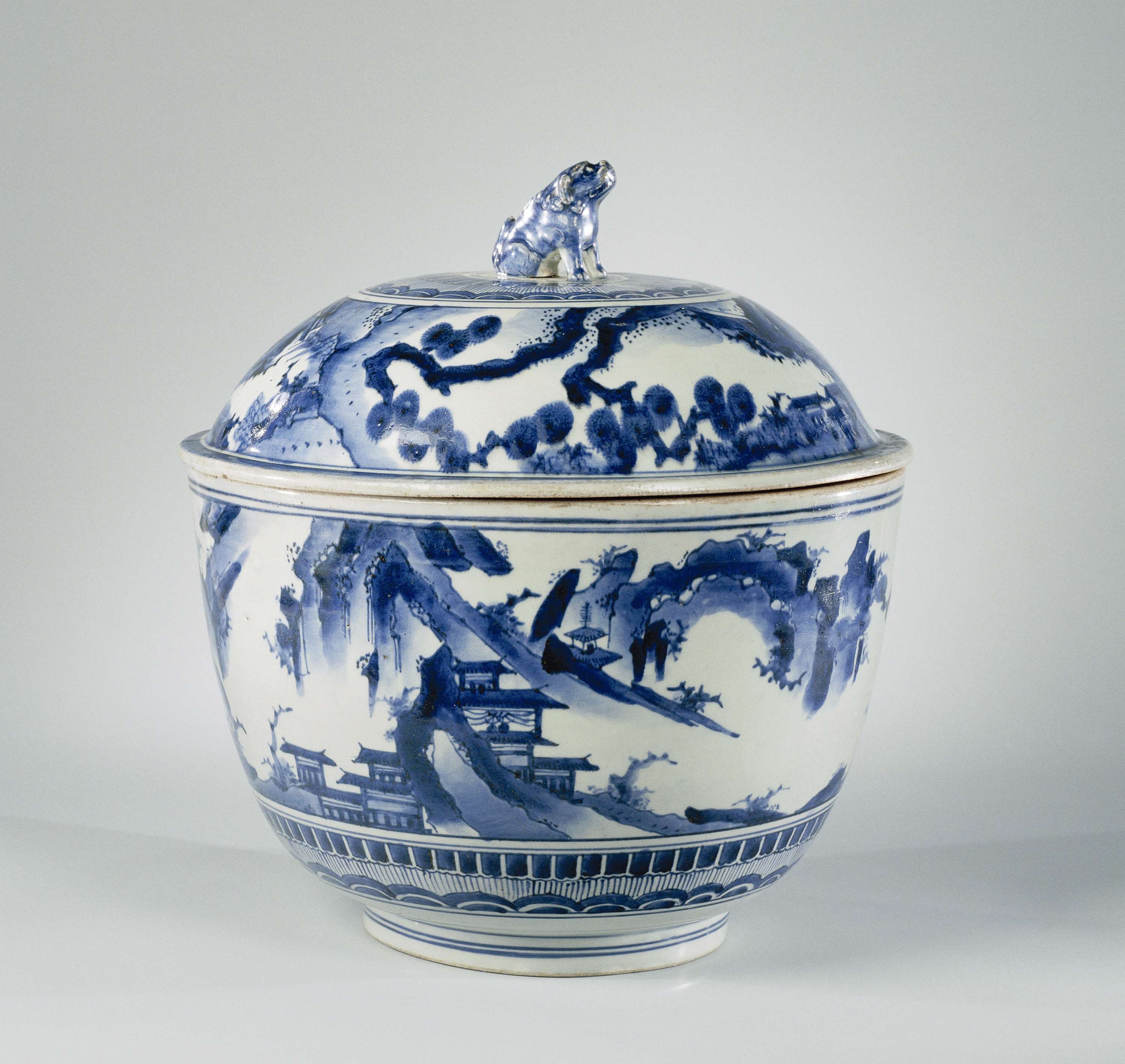 Large covered bowl wit a continuous landscape with pavillions, mountains and trees (Engels)