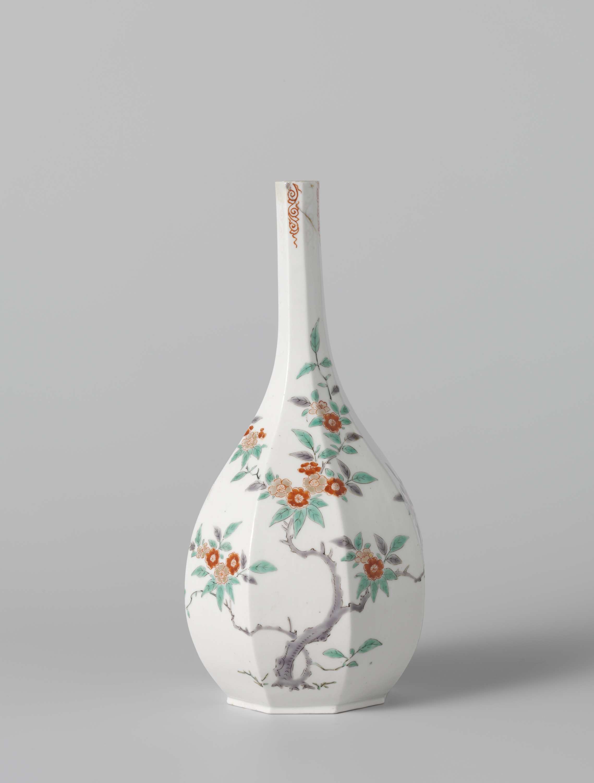 Achthoekige, flesvormige vaas met een bloeiende boom