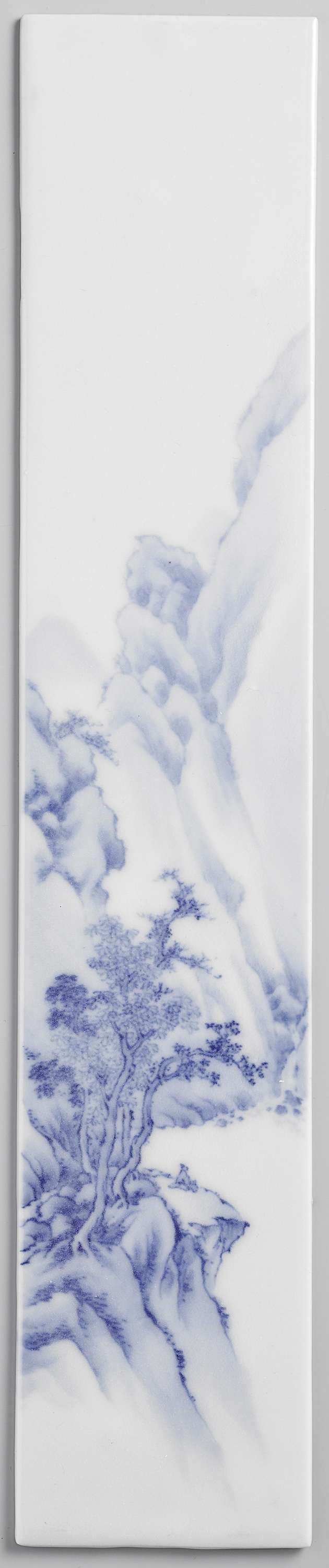 Plaque with a water landscape with a pavilion, trees, mountains and a waterfall (Engels)