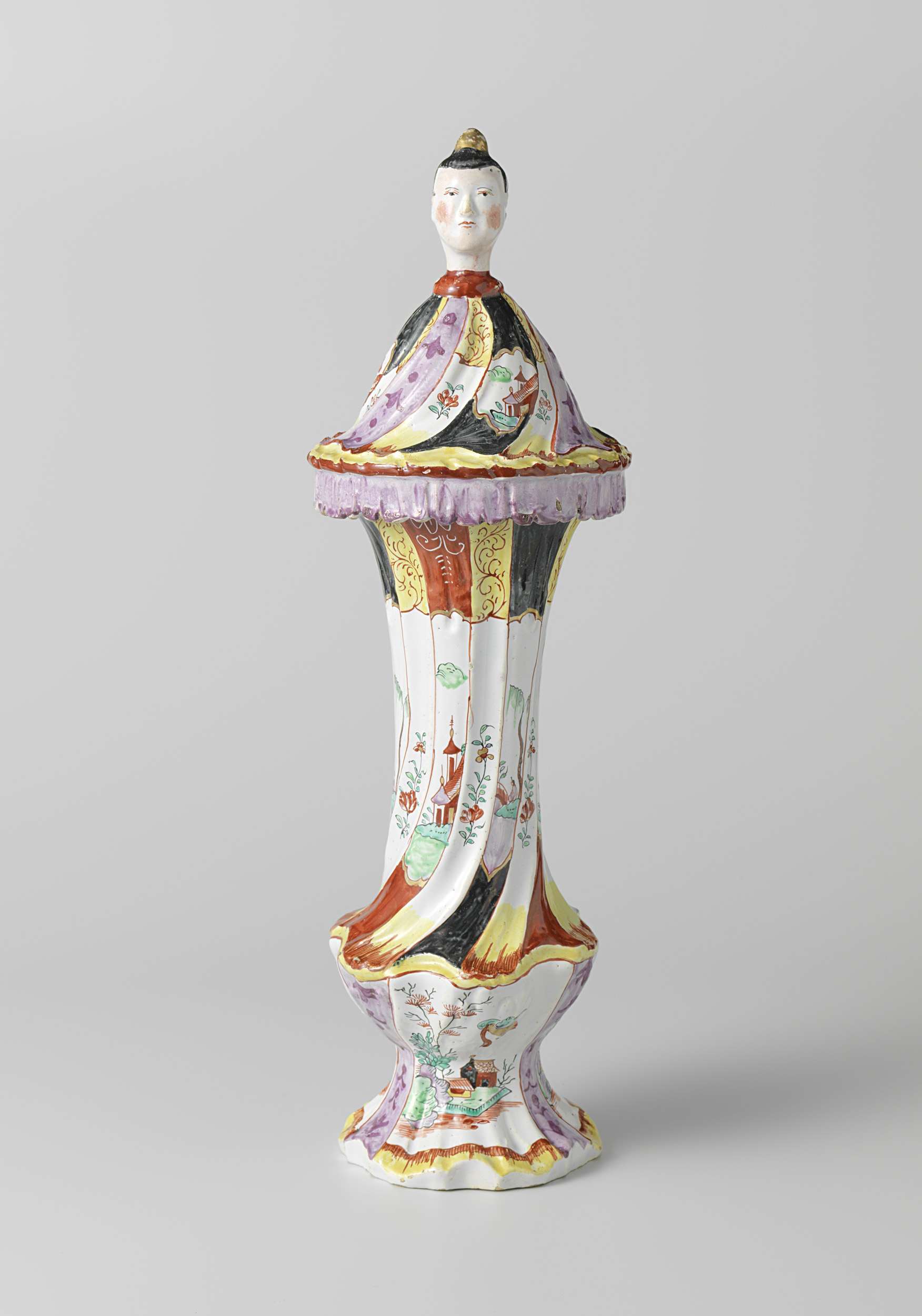 | Nederlands | Dekselvaas, beschilderd met pagodes, Chinese landschappen en boeketten |