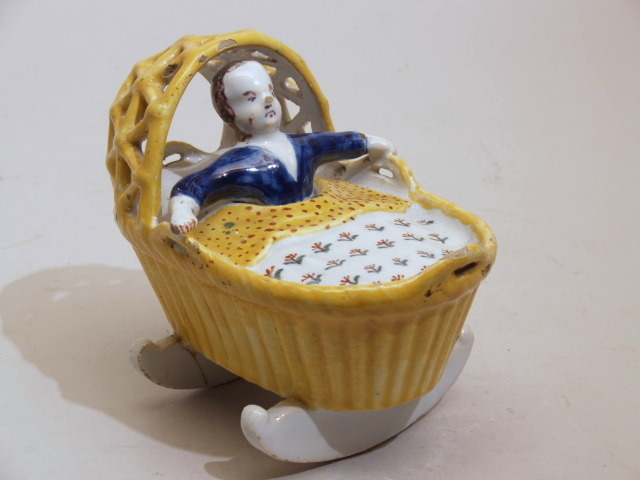 Een polychroom plastiek in de vorm van een kind in een gele wieg, het kind draag een blauwe top en is ingestopt onder een wit dekentje met rode bloemen en een geel laken met rode stippen (Q14195)