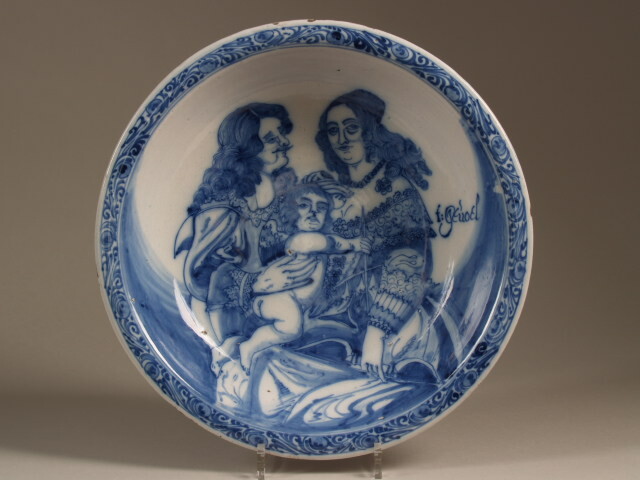 Een ronde schotel in blauw-wit gedecoreerd met een man, vrouw en kind, samen voorstellende een allegorie op het gevoel.