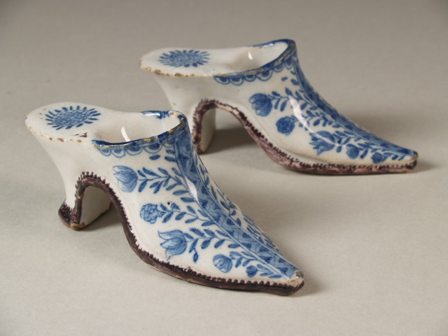 | Nederlands | Plastiek in de vorm van twee muiltjes, in blauw en mangaan gedecoreerd op een wit glazuur met florale motieven. |