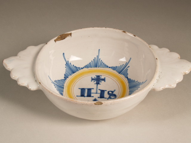 Papkom, centraal aan de binnenzijde gedecoreerd met het monogram IHS en een kruis in blauw, met daaromheen een gele rand en een stralenkrans in blauw||200002346 |