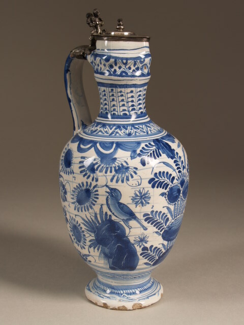 Een schenkkan met blauw-wit Chinees decor van vegetatie en vogels, gemonteerd met een zilveren deksel