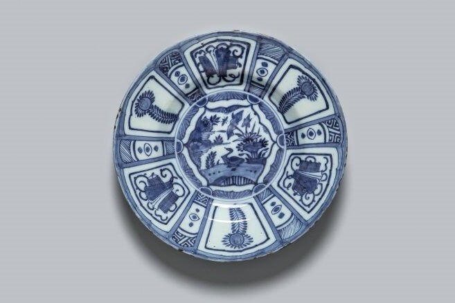 Bord in blauw-wit gedecoreerd met een op kraakporselein geïnspireerd decor van vakken gevuld met Chinese symbolen. Het plat is versierd met een decoratie van een oeverlandschap met bloeiende lotussen en een eend. (Nederlands)