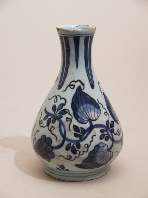 Peervormige vaas beschilderd met een decor van bladranken in blauw-wit. (Nederlands)