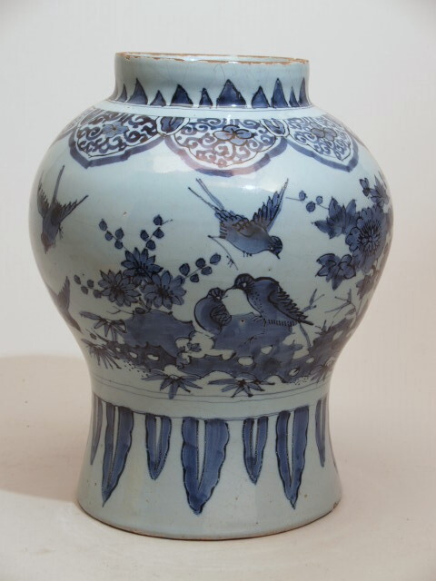 Pot met een balustervormige wand, in blauw gedecoreerd op een licht blauw glazuur met een voorstelling van bloemen en vogels.||200005171