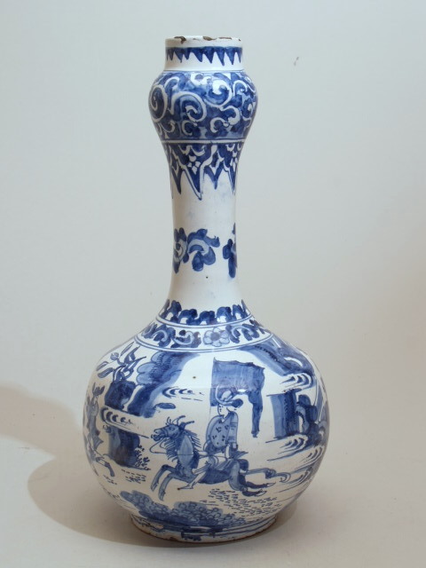 Flesvaas, in blauw gedecoreerd op een rozig wit glazuur. De buik is gedecoreerd met een decor van figuren te paard, verder is de vaas versierd met florale motieven.