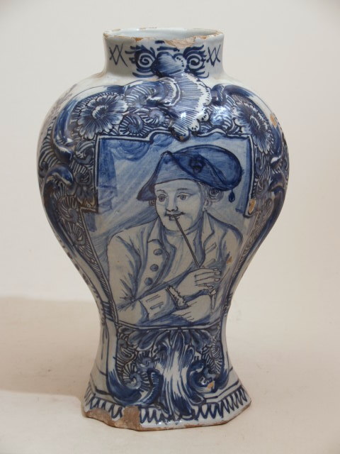 Balustervaas, in blauw gedecoreerd op een blauwig wit glazuur met op de ene zijde een decor van een pijprokende man met steek en op de andere zijde een decor van een huis in een berglandschap, verder is de vaas versierd met florale motieven. (Q14279)