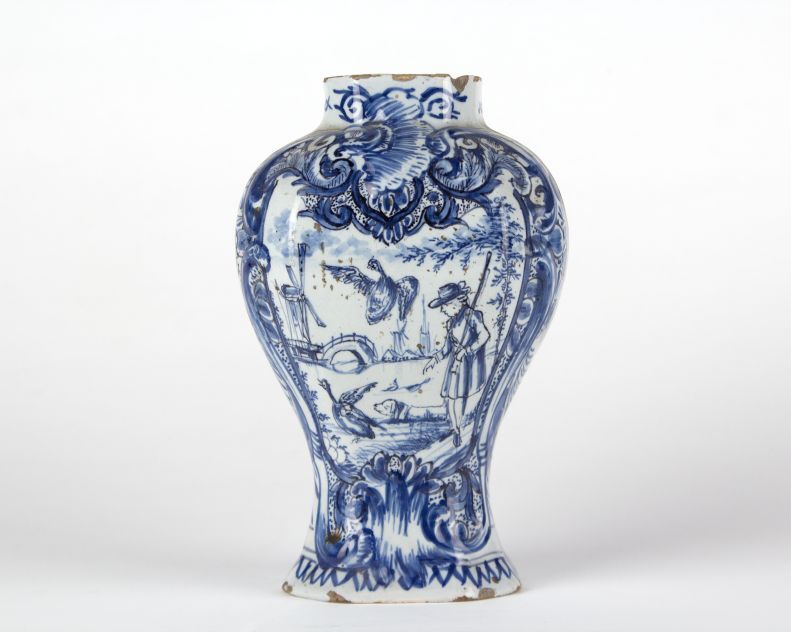 Balustervaas met decoratie in blauw op een wit glazuur. Op de buik beschilderd met een landschap met molen, brug, toren, jager en eenden in een rijk gedecoreerd cartouche. Op de andere een decor van een berglandschap. (Nederlands)