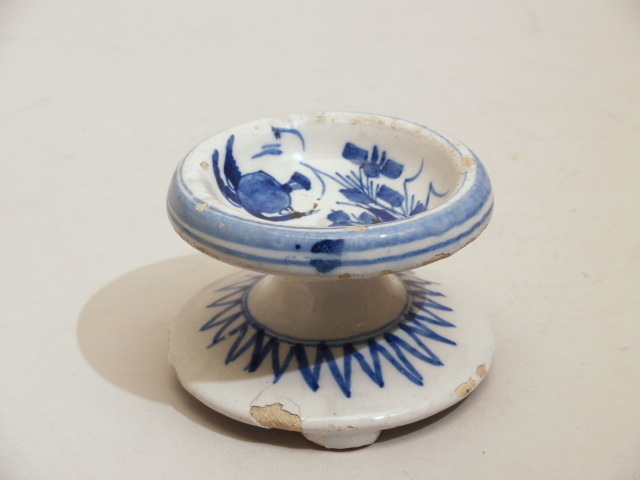 Rond zoutvat op verhoogte voet met ronde grondplaat in blauw-wit gedecoreerd met decor van een vogel temidden van vegetatie.