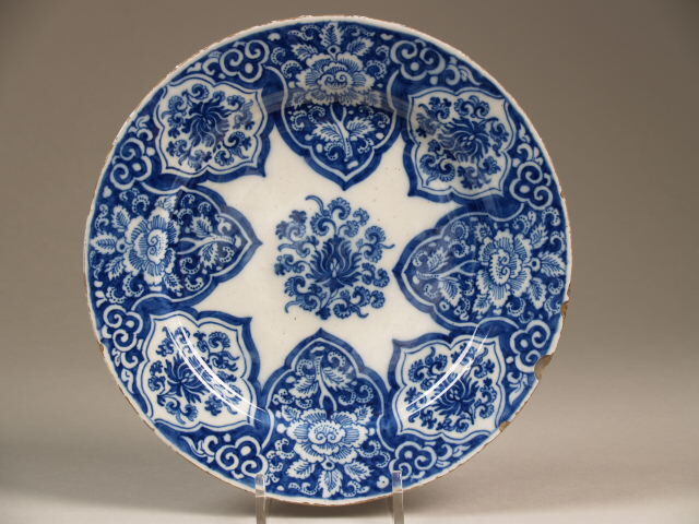 Rond bord, met licht concave bodem en een bolspreidende wand met afgeronde lip. De schotel is in blauw gedecoreerd op een romig wit glazuur met centraal op het plat een blad en bloemmotief en daaromheen een randmotief van Franse punten. (Nederlands)