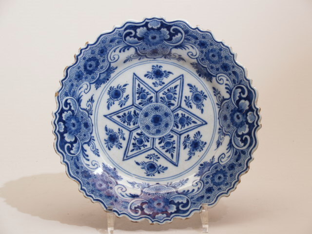 Bord met een geakkouleerde rand, in blauw gedecoreerd op een blauwig wit glazuur. Het plat is versierd met een zespuntige ster, gevuld en omringd door bloemen. De rand is versierd met een symmetrisch floraal rococomotief. (Nederlands)