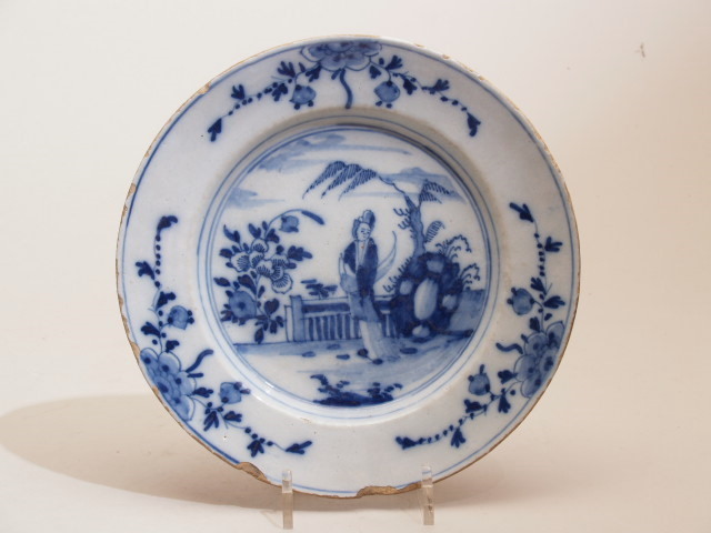 Bord, in blauw gedecoreerd op een grijswit glazuur. Het plat is versierd met voorstelling van een Chinese vrouw in een tuin met hekje, bloemen en boom, de rand is versierd met drie bloemversieringen en afgezet met een smalle dunne bies. (Nederlands)