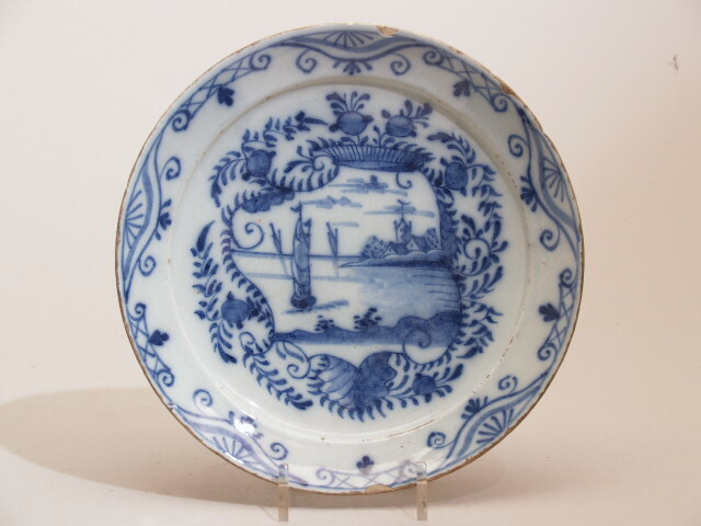 Bord, in blauw gedecoreerd op een blauwwit glazuur met op het plat een rivierlandschap met zeilboten in een met ranken versierd cartouche. De rand is versierd met een patroon van slingers en ruiten. (Nederlands)