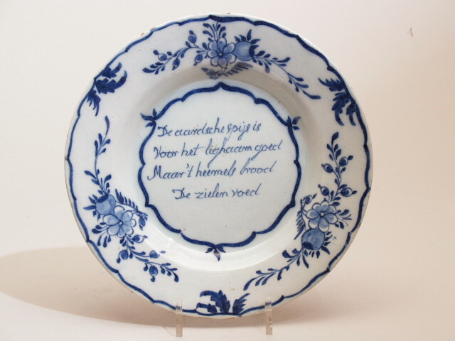 | Nederlands | Bord, in blauw gedecoreerd op een blauwig wit glazuur. Het plat is gedecoreerd met de spreuk: 'De aardsche spijs is voor het lichaam goed naar 't heemels brood De zielen voed'. De rand van het bord is versieerd met drie bloemenranken. |